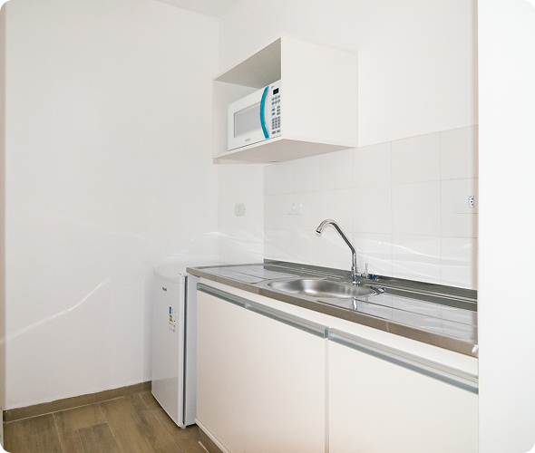 Equipado com fogão elétrico, micro-ondas e geladeira, tudo para preparar suas refeições com praticidade